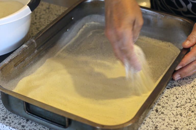 Blachę do pieczenia należy nasmarować i posypać mąką. Na dnie układamy warstwę suchej mieszanki, dbając o to, by była na tyle cienka, aby dno blachy nie było widoczne, lecz również na tyle gruba, by ciasto nie wyszło suche.