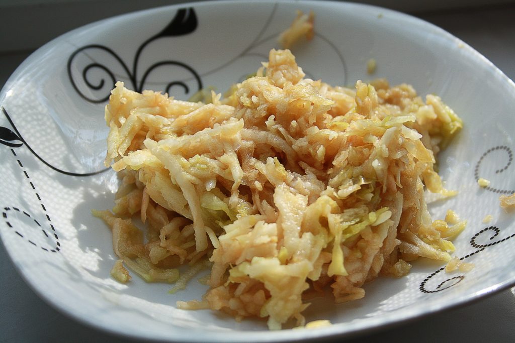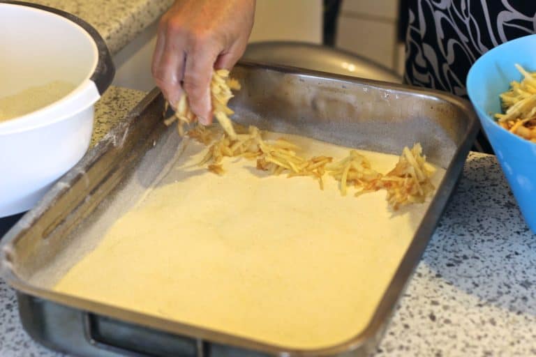 Następnie na suchej masie rozkładamy starte jabłka wraz z sokiem, starając się nie rozgniatać owoców. Powtarzamy warstwy, kończąc posypaniem wierzchu pozostałą częścią suchej mieszanki i zetrzeniem na wierzch masła lub margaryny.
