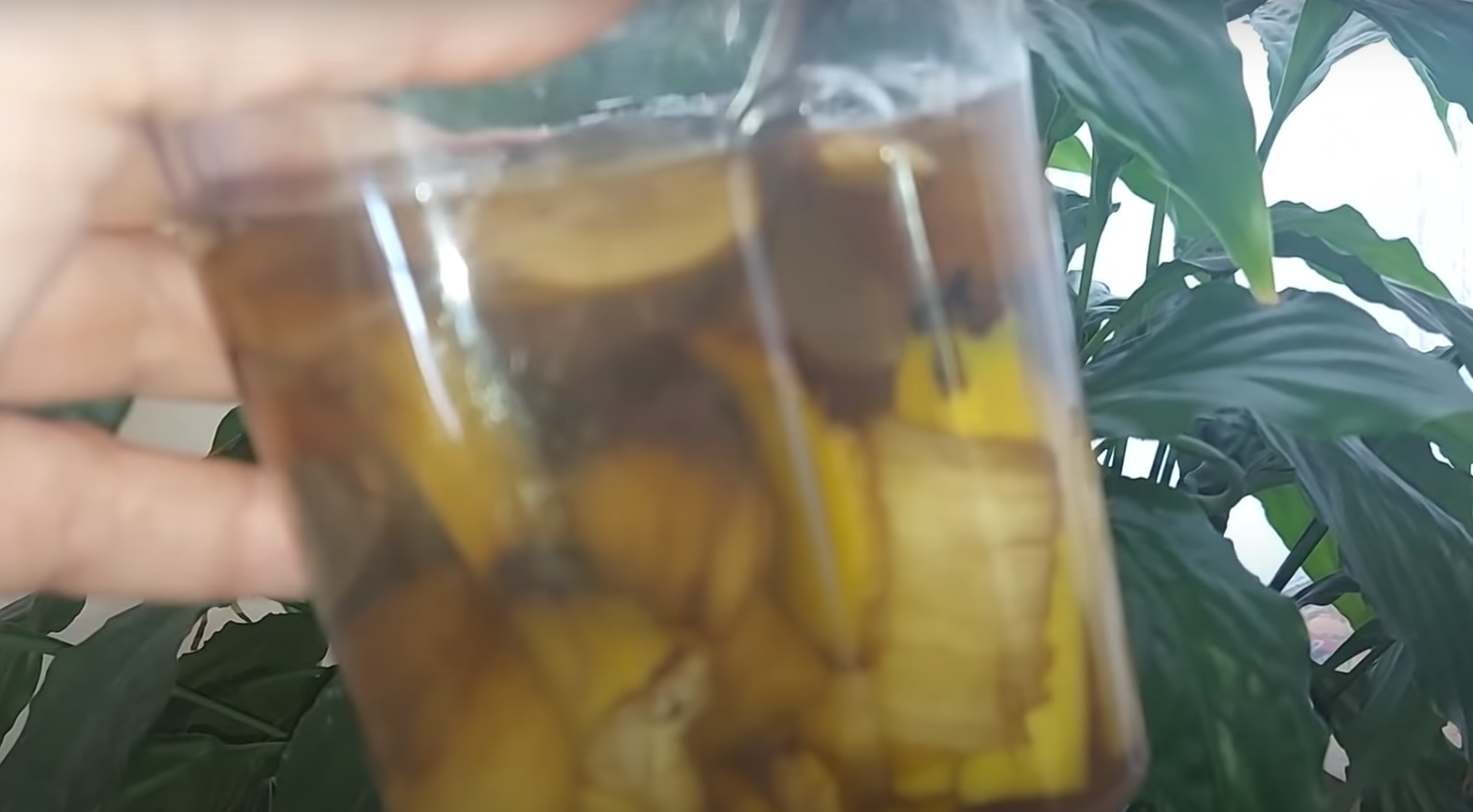 Włóż skórkę od banana do słoika. Dodać do niej 1 litr ciepłej wody. Roztwór należy odstawić do wyschnięcia w ciemnym miejscu na 24 godziny. Po upływie tego czasu można użyć nawozu. Można również spryskać liście roślin tym preparatem. To zniechęci je do powrotu.