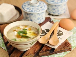 Początek przepisu jest taki sam. Po ugotowaniu filetu z kurczaka, można go teraz dodać na patelnię. Sól i woda są następnie połączone z czosnkiem. Następnie do mięsa dodaje się bulion, sok z cytryny i dwa przepołowione jajka. Tofu jest następnie posiekane i dodane do miski z zupą.