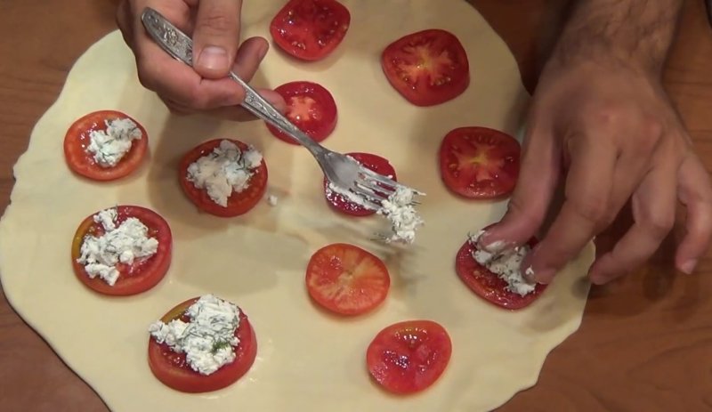 Pomidory dokładnie umyj i obierz w plastry. Ciasto na bułki podziel na dwie równe części. Rozwałkuj jedną z nich. Plastry pomidorów połóż na cieście, tak żeby między nimi było około 3 cm odległości. Na każdym plasterku połóż trochę nadzienia z sera.