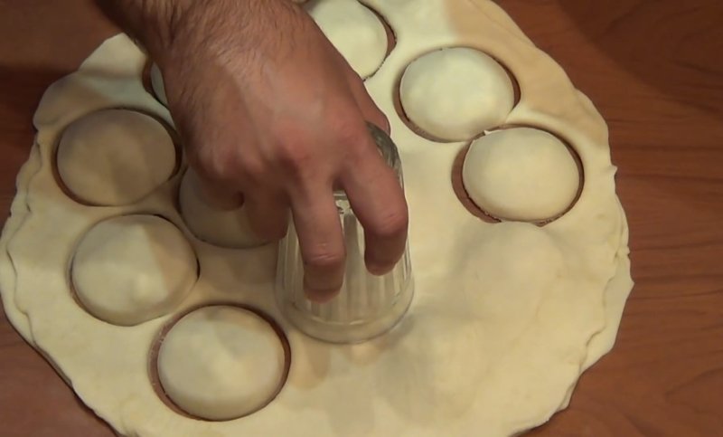 Następnie rozwałkuj drugie ciasto i przykryj nim ciasto z pomidorami. Przy pomocy szklanki większej od średnicy pomidorów wycinaj okrągłe bułki wokół konturów warzyw.