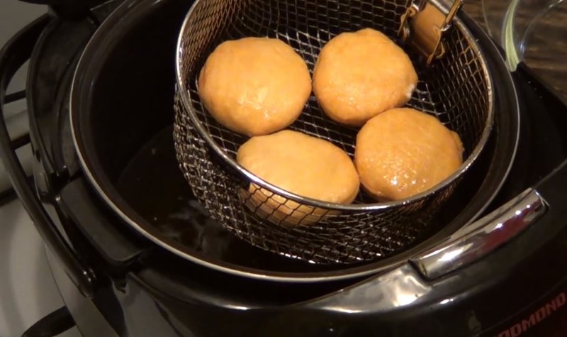 Tak przygotowane bułeczki smaż na głębokim tłuszczu. Bułeczki będą gotowe, kiedy zarumienią się.
