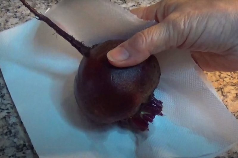 Dokładnie szczotkujemy buraki pod bieżącą wodą. Następnie odsączamy nadmiar wilgoci z warzyw za pomocą ręczników papierowych.
