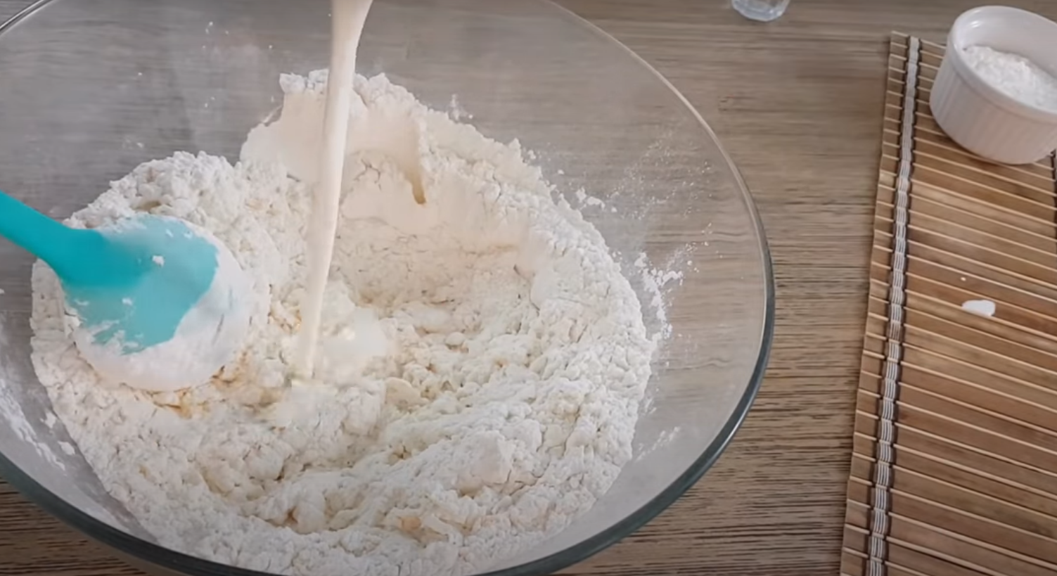 Do miski wsypać mąkę, wymieszać żółtka, wlać śmietanę, dodać kolejną łyżeczkę octu i dobrze wymieszać.