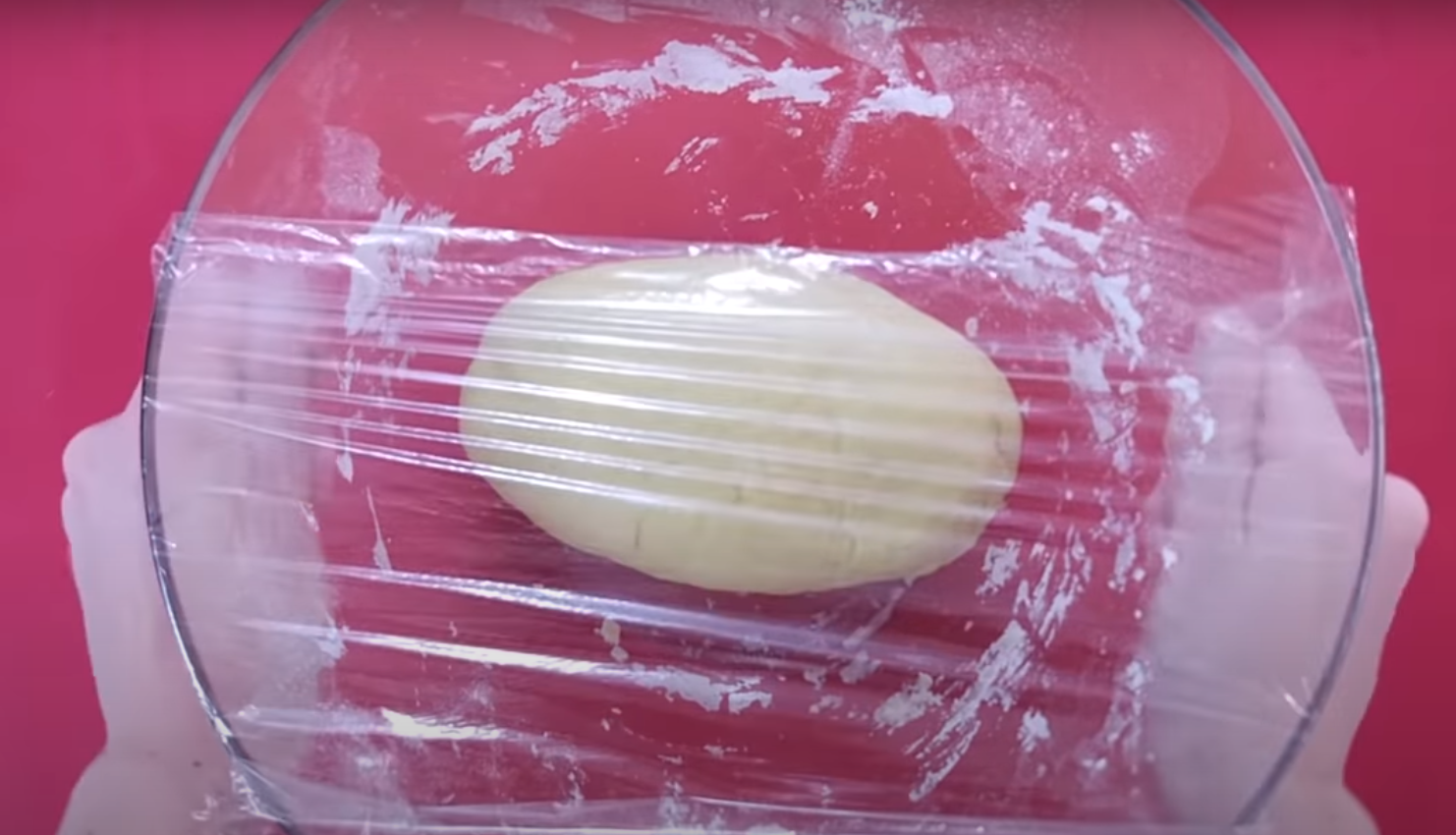 Ciasto układamy na blacie i dokładnie mieszamy przez około 10 minut. Następnie wkładamy do miski, przykrywamy folią spożywczą i odstawiamy na 30 minut.