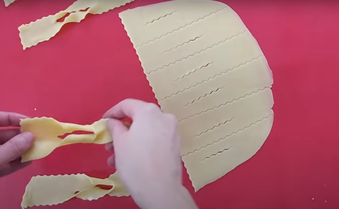 Następnie kroimy ciasto na mniej więcej te same kawałki, każdy kawałek zwijając. Kroimy na paski o tej samej szerokości, które następnie przecinamy na pół. W środku każdej części wycinamy pasek, przez który zaginamy jedną krawędź, aby uzyskać ładny kształt.