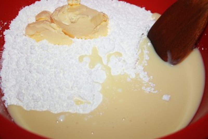 Aby przygotować ciasto, wymieszaj łyżką, a następnie rękoma skondensowane mleko, skrobię i miękką margarynę. Ciasto powinno być elastyczne i nie przylegać do rąk.