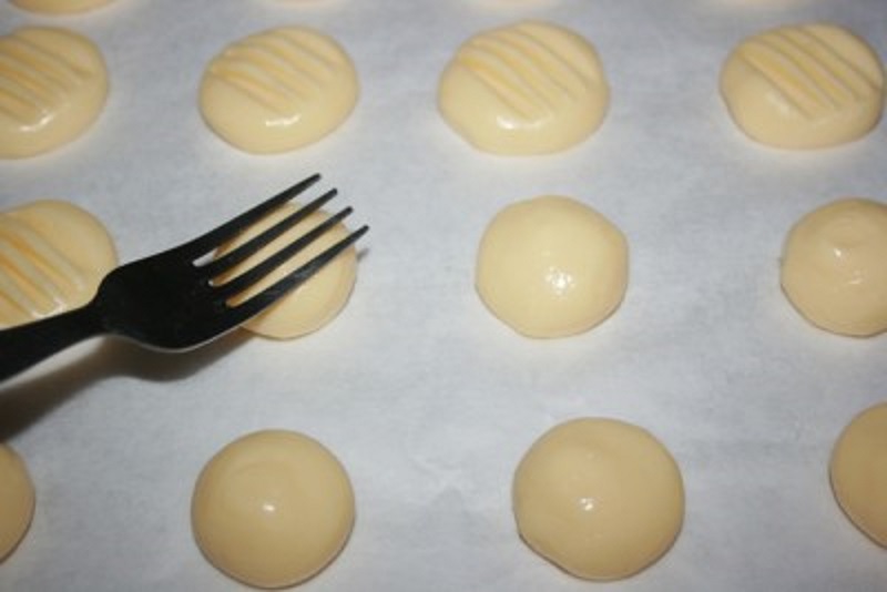 Przykryj blachę do pieczenia papierem i ułóż tam powstałe smakołyki, nie zapominając o zachowaniu odległości między nimi. Naciśnij każdą kulkę lekko widelcem.
