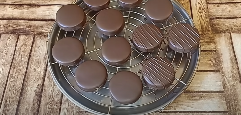 Tak przygotowane nadzienie wykładamy na koła. Kolejno zanurzamy je w polewie przygotowanej z czekolady i tłuszczu.