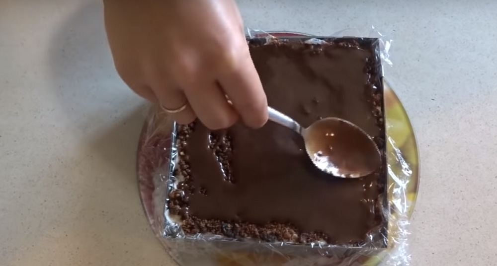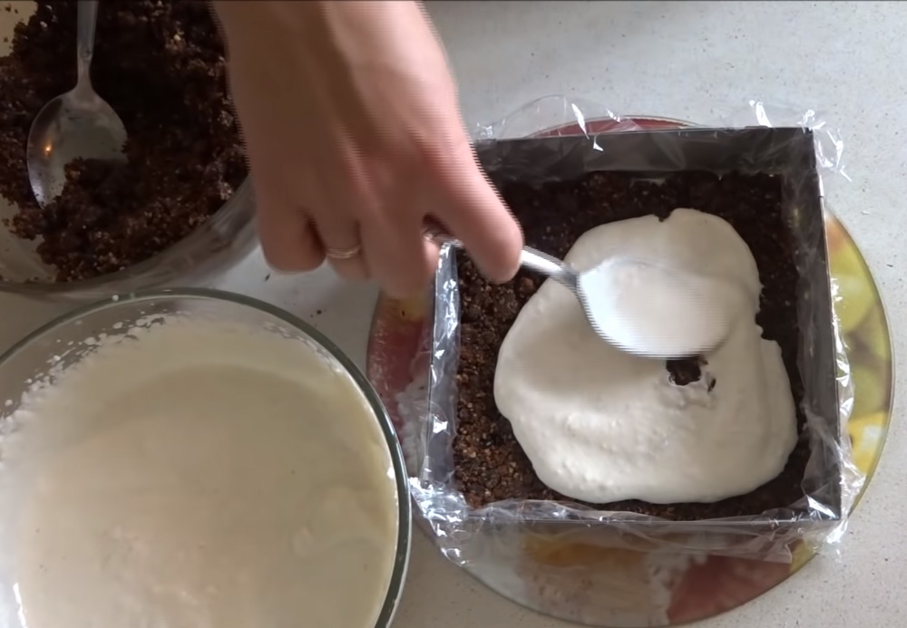 Przygotowujemy foremkę do ciasta i przykrywamy ją folią. Ciasto układamy warstwowo: na zmianę cienka warstwa kawałków czekolady i warstwa śmietany. Na wierzchu powinniśmy mieć warstwę czekoladową.
