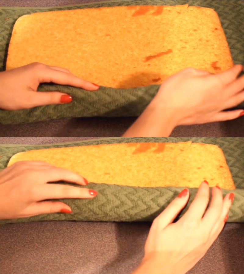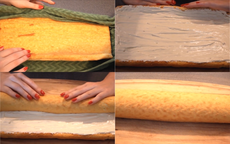 Upieczone ciasto wyjmij z piekarnika na ręcznik, razem z ręcznikiem zwiń i pozostaw do ostudzenia.