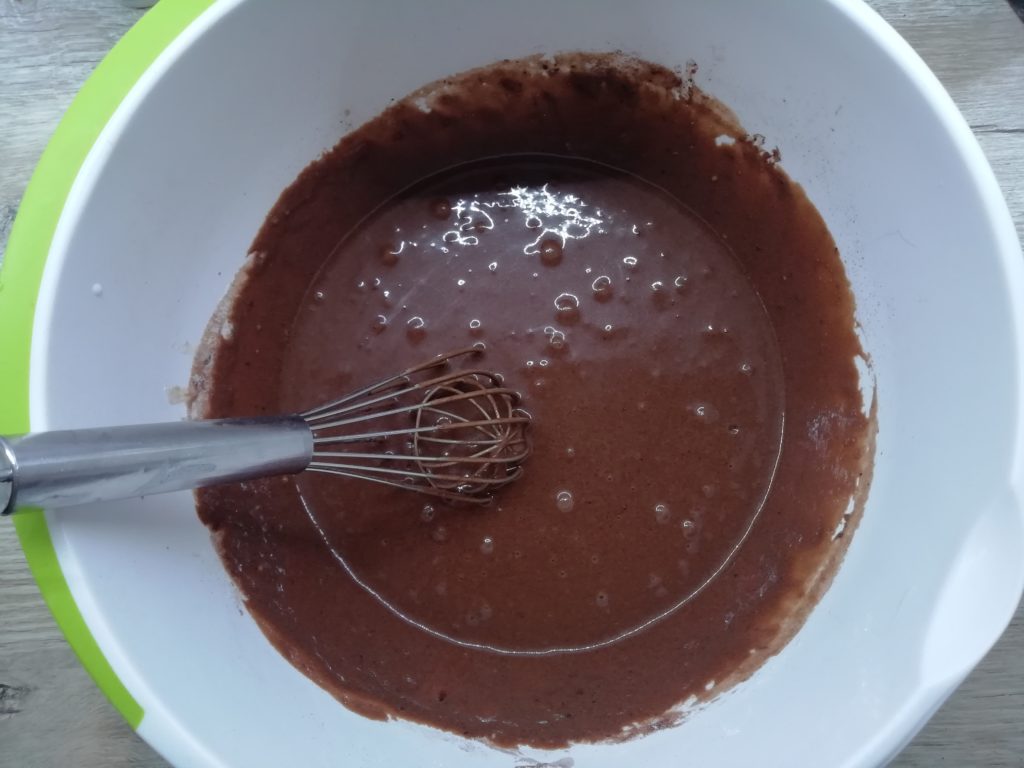 Do nowej miski przekładamy banany, dodajemy jajka i sol. Mieszaj trzepaczką. Wsyp kakao i proszek do pieczenia, a następnie dokładnie połącz składniki.