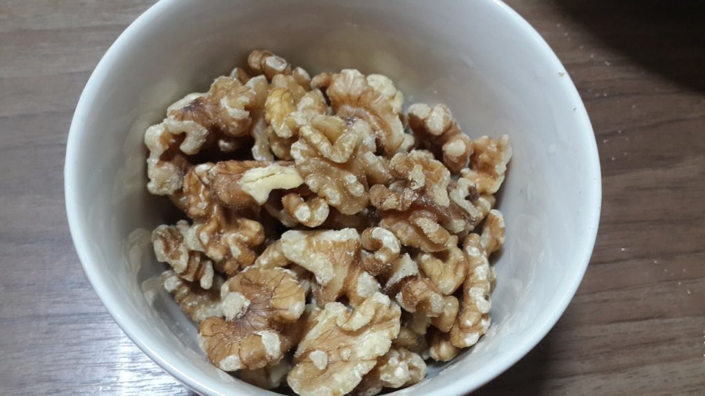 Do miski z płatkami owsianymi wlej masę bananową i dokładnie wymieszaj. Foremkę posmaruj miękkim masłem i wlej w nią przygotowane ciasto. Na wierzchu posyp orzechami.