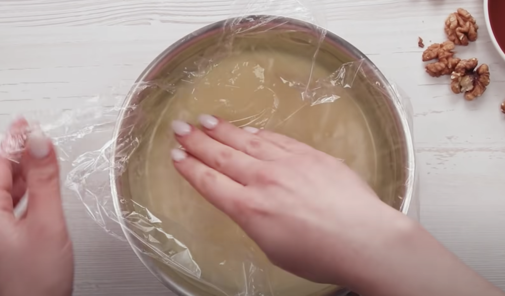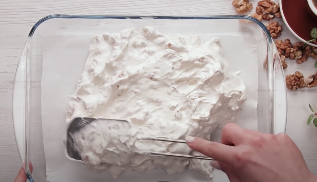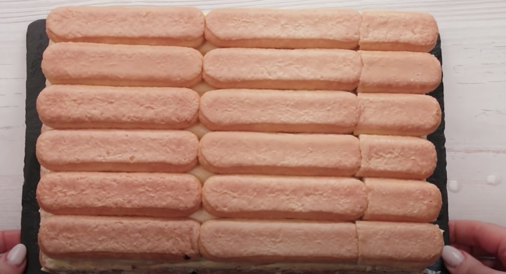 Namoczone biszkopty ułóż równo i nałóż na nie połowę kremu. Następnie wyłóż upieczoną warstwę z orzechami, a na nią drugą połowę kremu. Na wierzch ułóż kolejną warstwę namoczonych biszkoptów. Całość włóż do lodówki.