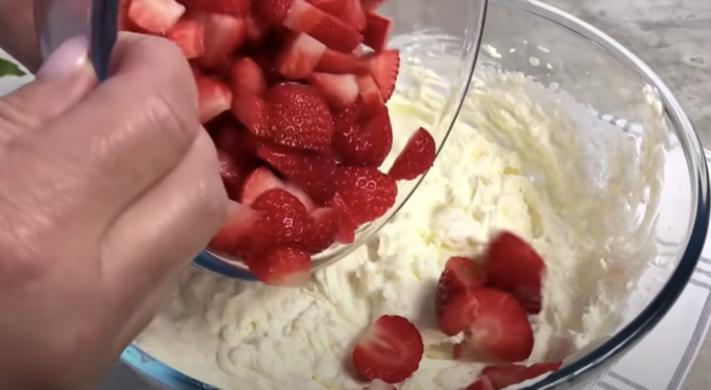 Przygotuj truskawki po przez ich umycie oraz pokrojenie na ćwiartki. Po tym dodaj owoce do przyszłego kremu.