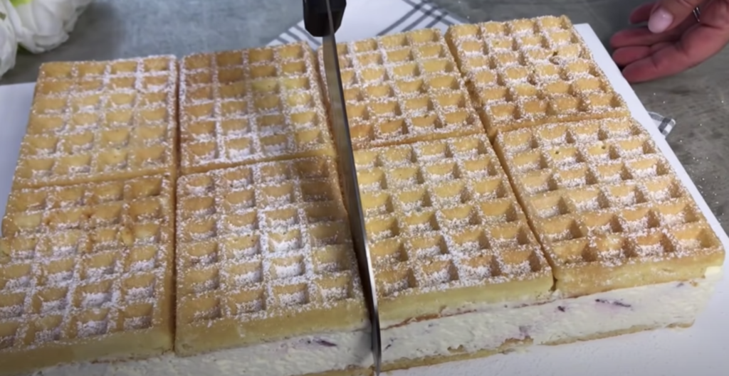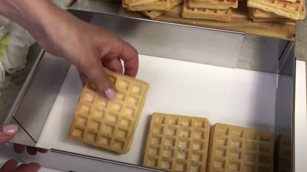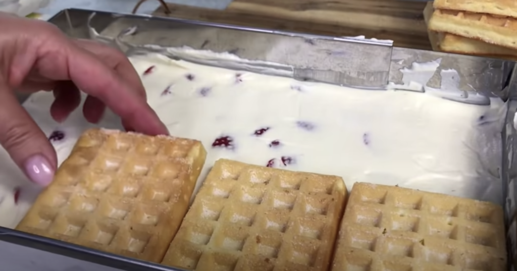 Blaszkę do pieczenia należy wypełnić goframi, następnie nałóż na nie przygotowany krem z truskawkami,