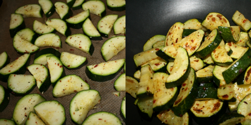 Tak przygotowaną cukinię wysypać na blaszkę wyłożoną papierem do pieczenia. Wstawić do wcześniej rozgrzanego piekarnika i piec ok 15 min w 200 stopniach.