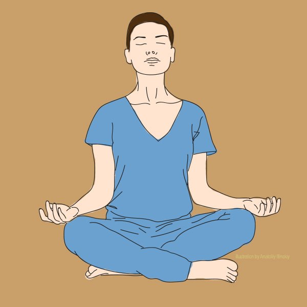 Usiądź po turecku, rozluźnij ciało i wyciągnij kręgosłup w górę, prostując się. Możesz lekko unieść podbródek i oprzeć dłonie na kolanach.