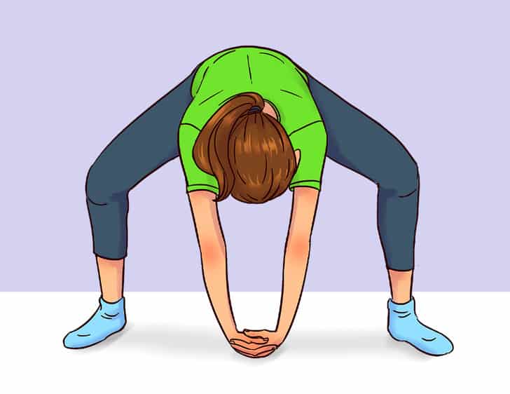 Stań na podłodze. Stopy powinny by rozstawione na szerokości bioder, zaś palce skierowane na boki, a kolana ugięte. Unieś ręce do góry i wyciągnij się tak wysoko, jak się da. Kolejno powoli pochyl się do przodu, do momentu oparcia dłoni na podłodze.