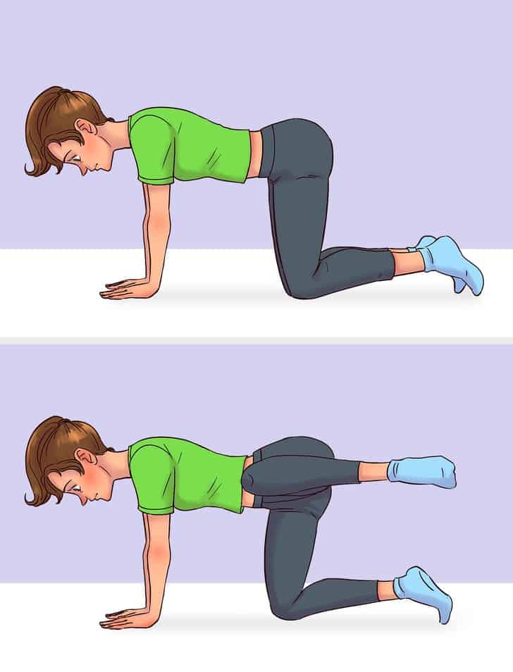 Dłonie połóż pod ramionami, kolana pod biodrami. Utrzymuj proste plecy i zgięcie w kolanach. Lewą nogę odsuń na bok, na wysokość bioder. Następnie przywróć ją do pierwotnej pozycji. Powtarzaj ćwiczenie przez około minutę zmieniając nogę.