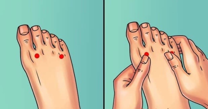 Po ciężkim i długim dniu większość z nas odczuwa ból kończyn dolnych. W szczególności Panie, które większość dnia poruszają się na szpilach. By temu zaradzić połóż pace rąk na punkcikach przedstawionych na obrazku. Delikatnie je masuj. Dzięki temu rozluźnisz także odcinek szyjny kręgosłupa.