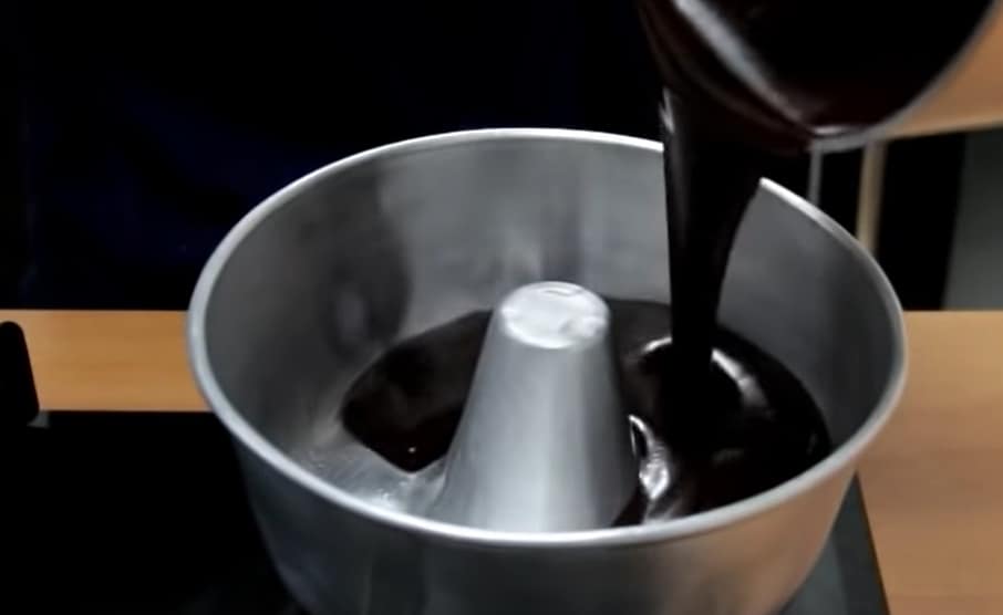 Najpierw przygotowuj czekoladową warstwę. Wlej śmietanę do garnka, dodaj połamaną czekoladę i gotuj do momentu, aż czekolada się roztopi i masa będzie jednolita. Wlej masę czekoladową do formy i włóż do zamrażarki.