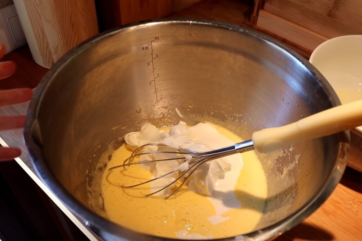 W osobnym naczyniu ubij mikserem białka tak, by otrzymać sztywną pianę. Dodaj do białka kilka kropli soku z cytryny lub kwasku cytrynowego w momencie, gdy zaczyna się pienić. Delikatnie przełóż pianę do miski z pozostałymi składnikami. Ostrożnie wymieszaj ciasto trzepaczką lub łyżką.