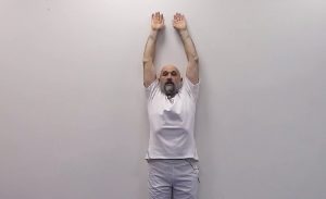 Stań prosto, trzymaj plecy wyprostowane, a dłonie z łokciami zgiętymi przed sobą. Przy głębokim wdechu podnieś jedną rękę w górę, odwracając dłoń na zewnątrz, jakbyś coś odpychał, przy czym głowa niech podąża za dłonią. Drugą rękę wyciągnij w dół. Następnie, z drugą ręką wykonaj to samo w górę, a pierwszą w dół.