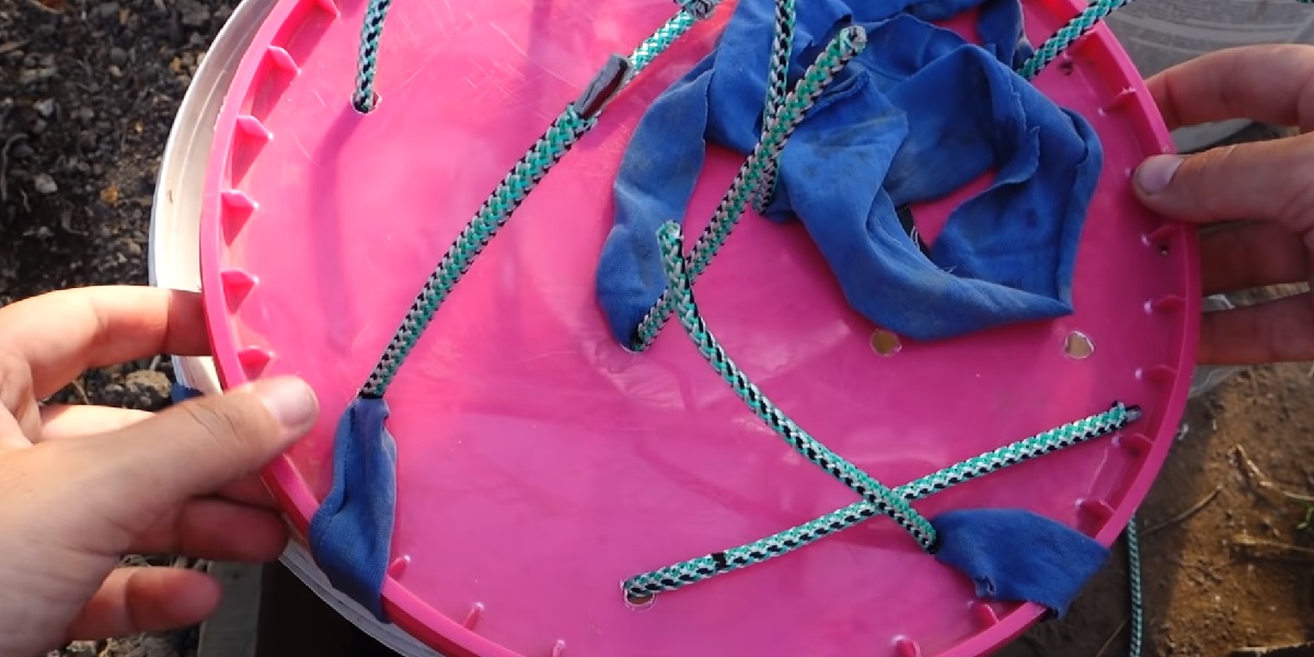 Zamontuj paski i sznurki w dziurach wykonanych w pokrywie od 10 litrowego wiadra tak, aby mniej więcej połowa materiału/sznurka znajdowała się pod nią, a druga połowa nad nią. Paski i sznur powinny, po zamontowaniu pokrywy, dotykać dna wiadra.