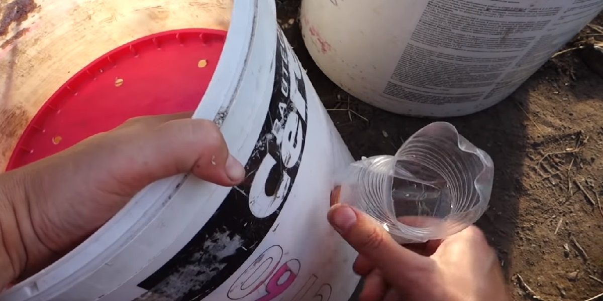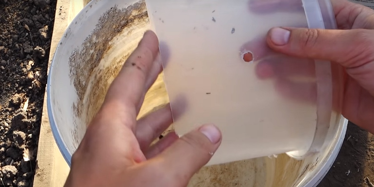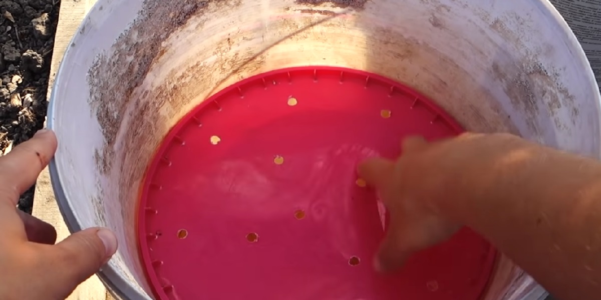 Wytnij dno z 5 litrowego wiaderka. Na ścianach zrób 3 – 4 niewielkie otwory w losowych miejscach. Następnie umieść wiaderko w większym wiadrze.