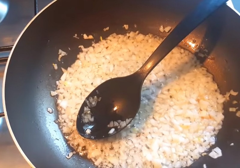 W tym czasie umyj i obierz cebulę i kapustę. Warzywa drobno posiekaj. Cebulę smaż na średnim ogniu aż stanie się złocista. Dopraw ją odrobiną pieprzu i soli.