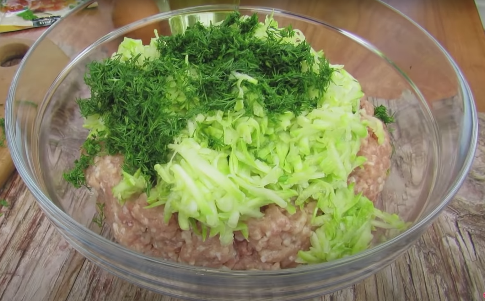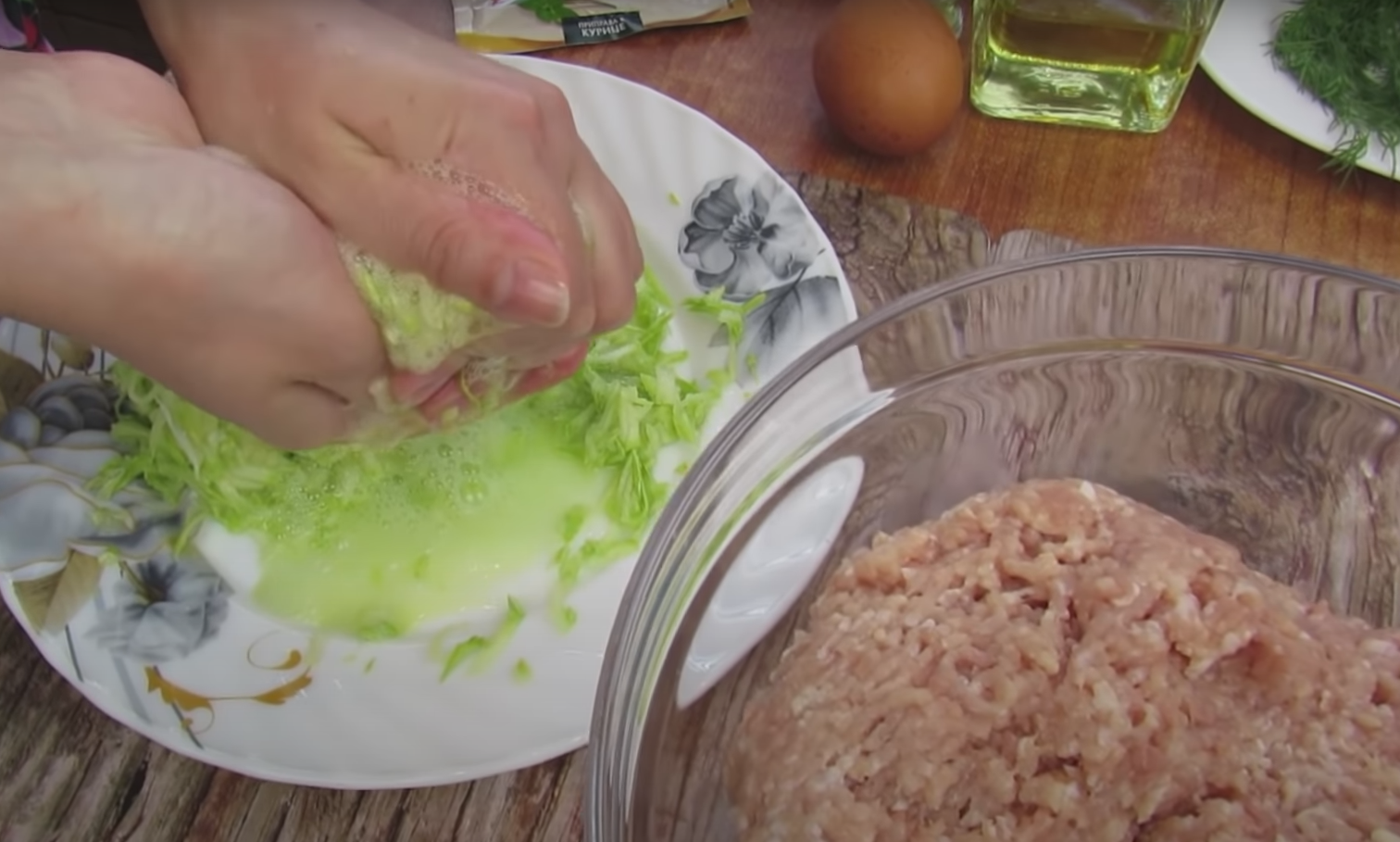 Cukinię zetrzeć na tarce. Dodać cukinię do mięsa, wycisnąć sok i dobrze wymieszać. Posiekany koperek wmieszać do miski.