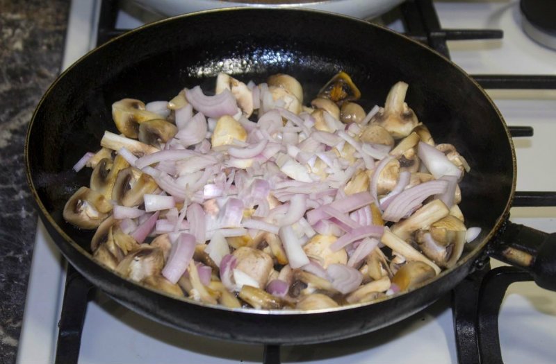 W dużym rondlu rozgrzej masło. Dodaj na patelnię posiekaną cebulę i grzyby. Gotuj do momentu uzyskania złotego koloru.