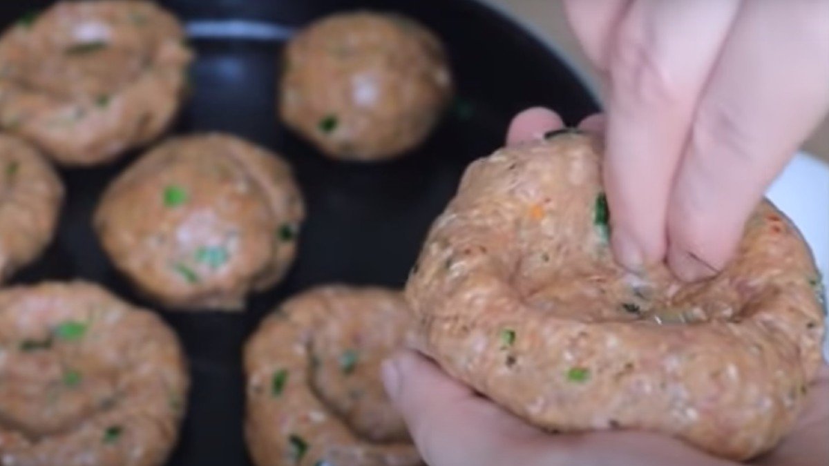 Rękami wymieszaj mięso i posmaruj je olejem roślinnym, oderwij kawałek, uformuj z niego kulkę i umieść go na blasze. Powtórz to samo z każdym kawałkiem, palcami zrób wgłębienie na środku, aby powstało gniazdo. Piecz w temperaturze 180 stopni przez 20 minut.