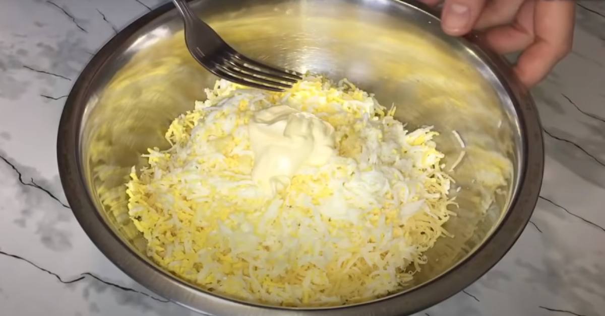 Jajka ugotuj na twardo, ostudź i drobno zetrzyj wraz z serem na tarce. Dopraw solą, a następnie czosnek przeciśnij przez praskę. Do tego dodaj majonez i dokładnie wszystko wymieszaj.