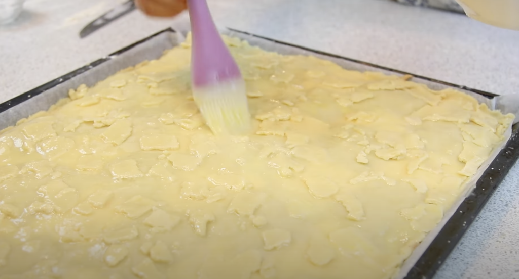 Ponakłuwaj ciasto widelcem, a następnie pokryj je masą jajeczną. Piecz przez 40 minut w temperaturze 180°C.