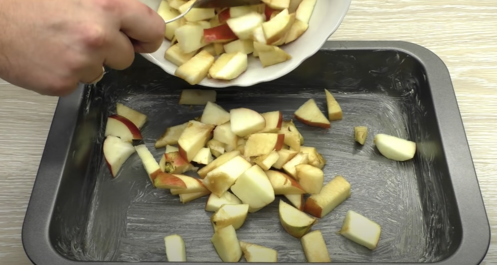 Skrapiamy jabłka sokiem z cytryny i układamy na wysmarowanej masłem blasze do pieczenia o wymiarach 21×31 cm.
