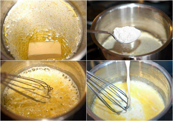 Ziemniaki obierz i ugotuj w lekko osolonej wodzie na półtwardo. W międzyczasie przygotuj sos beszamelowy. Masło rozpuść w rondelku, dodaj mąkę i dokładnie wymieszaj, nie ściągając z ognia.