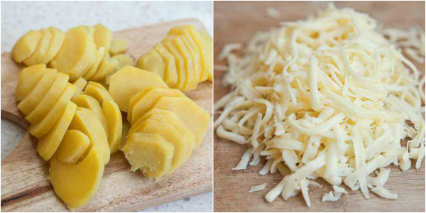 Gdy zobaczysz białą pianę, dolej zimne mleko, posól i nadal gotuj mieszając. Gdy dojdzie do wrzenia, bezzwłocznie zdejmij sos z ognia. Mięso pokrój na kawałki, cebulę na pierścienie a ziemniaki w plastry. Na tarce zetrzyj ser.