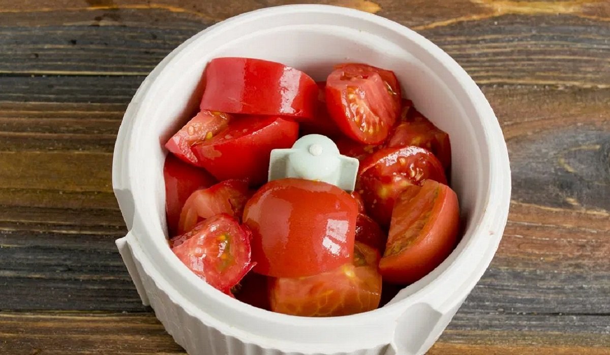 Czosnek, pomidory i cebulę przekręcić przez maszynkę do mięsa lub posiekać w blenderze. Wymieszaj powstałą masę warzywną z mięsem mielonym, solą i pieprzem.