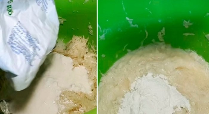 Na grubych oczkach tarki zetrzyj cebule i dodaj do kapusty. Do warzyw dodaj jajko, mąkę, kefir, proszek do pieczenia i wszystko wymieszaj.