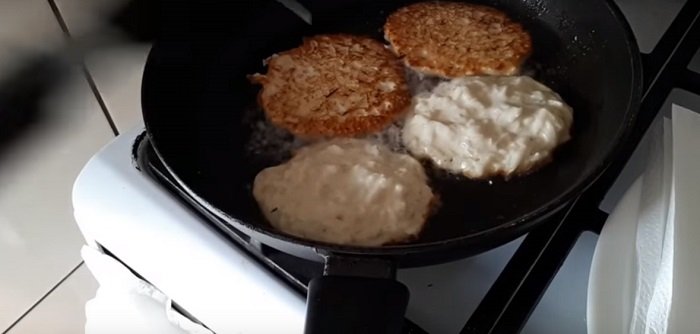 Na rozgrzaną patelni wlej olej, za pomocą łyżki stołowej uformuj placki. Smaż je 3 minuty po obu stronach, aż uzyskają złoty kolor.