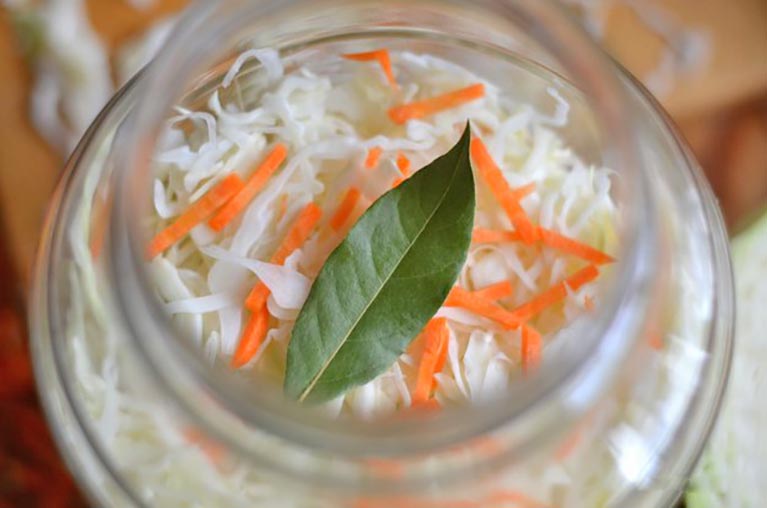 Na dnie słoika połóż liść laurowy. Następnie połóż warstwę kapusty, a na nią marchew. Układaj naprzemiennie warstwy warzyw oraz je ugniataj.
