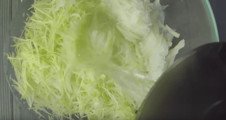 Na początek zetrzyj kapustę i cebulę na tarce o drobnych oczkach. Można również posiekać je nożem.