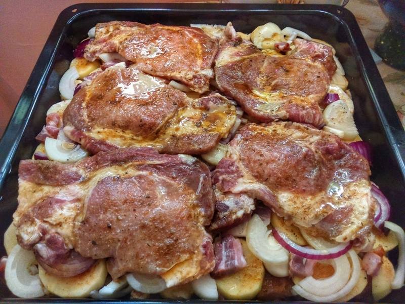 Kontynuuj proces – dodaj kolejną warstwę ziemniaków i cebuli, boczek i karkówkę.