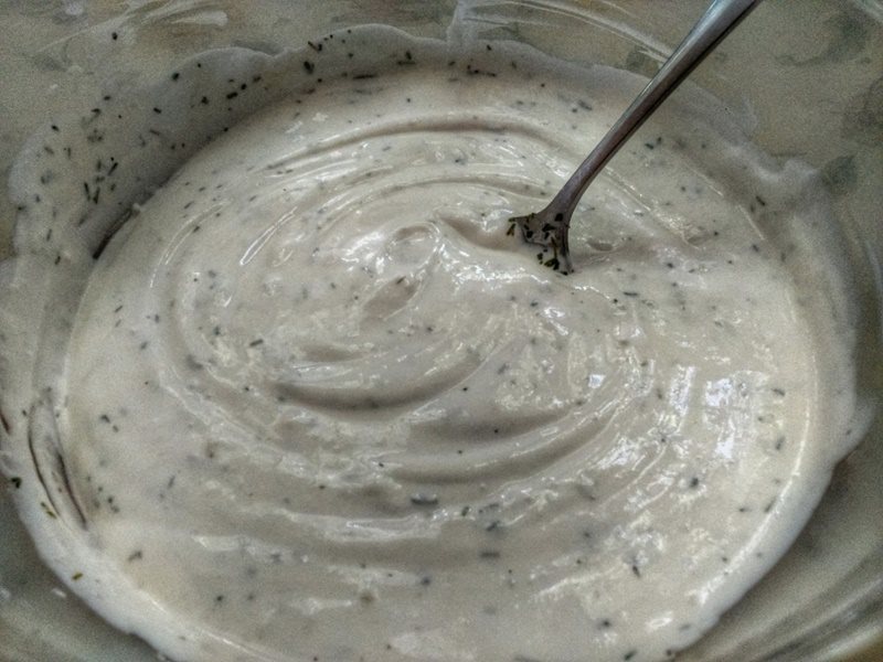W tym czasie przygotuj sos. Połącz śmietanę, wyciśnięty czosnek i ulubione przyprawy.