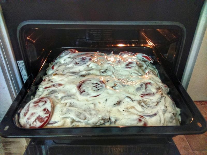 Folię aluminiową należy zdjąć z blachy na kilka minut przed końcem pieczenia. Wylej sos na potrawę. Wstawić naczynie z powrotem do piekarnika, ale tym razem z założoną pokrywką. Gdy sos się zrumieni, wyłączyć grzanie. Gotowe!