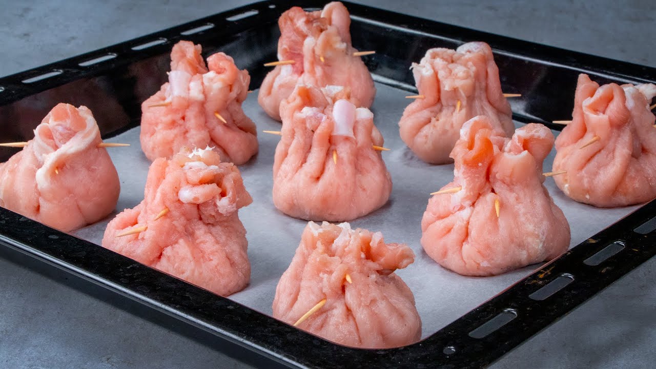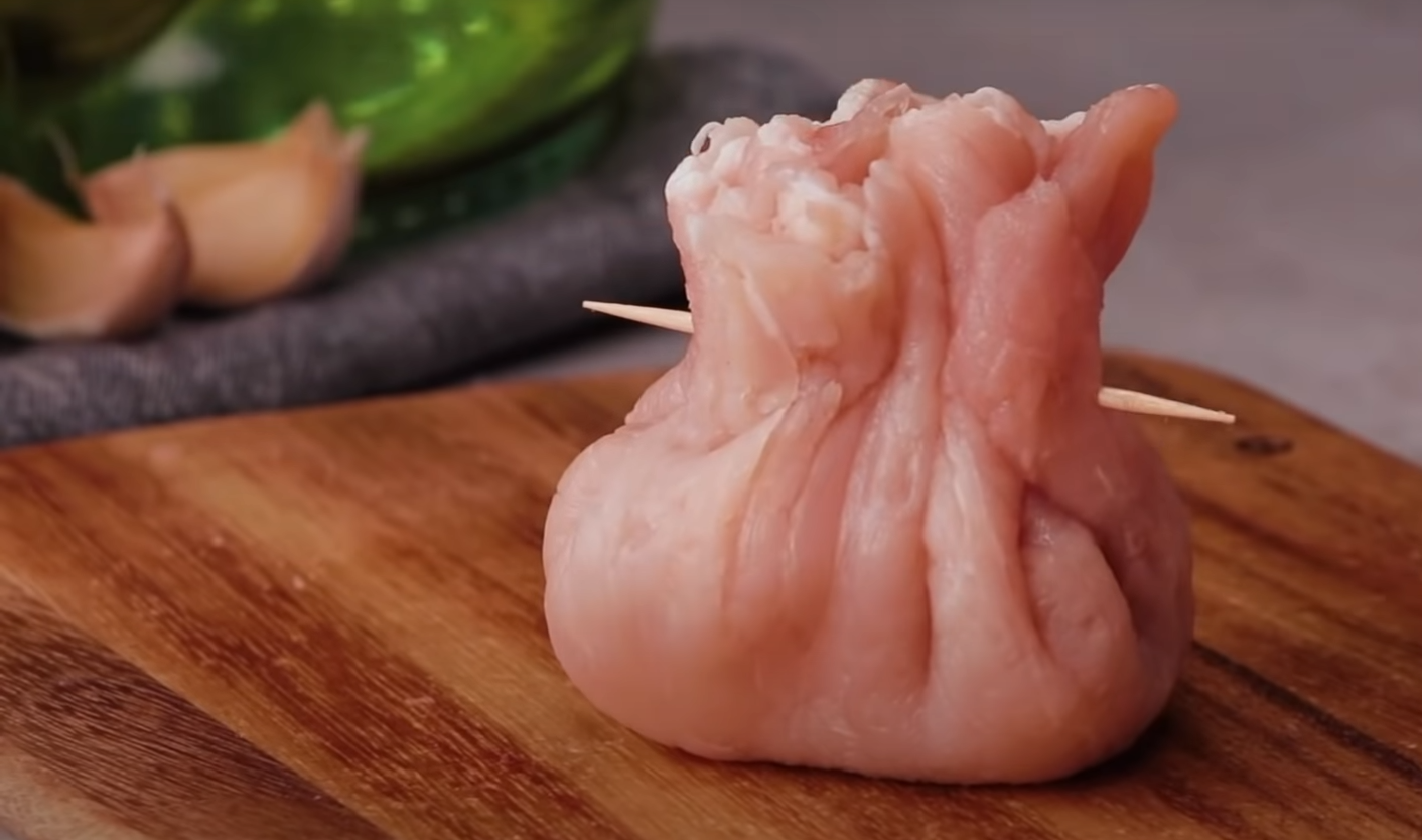 Następnie zawiń mięso, łącząc jego krawędzie u góry, szczep za pomocą wykałaczki.