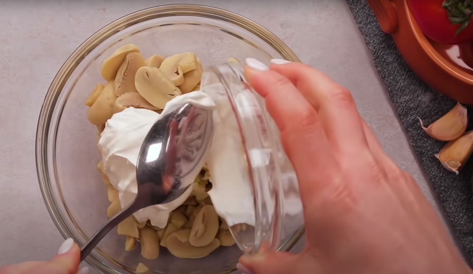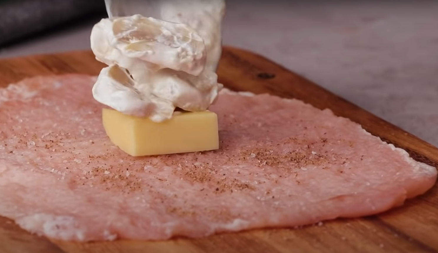 Posól i popierz z obu stron. Ser pokrój na mniejsze kawałki i umieść po jednym kawałku na środku każdego plastra mięsa. Pieczarki odcedź i pokrój na mniejsze kawałki. Włóż do miski, wymieszaj z przeciśniętym przez praskę czosnkiem i śmietaną.